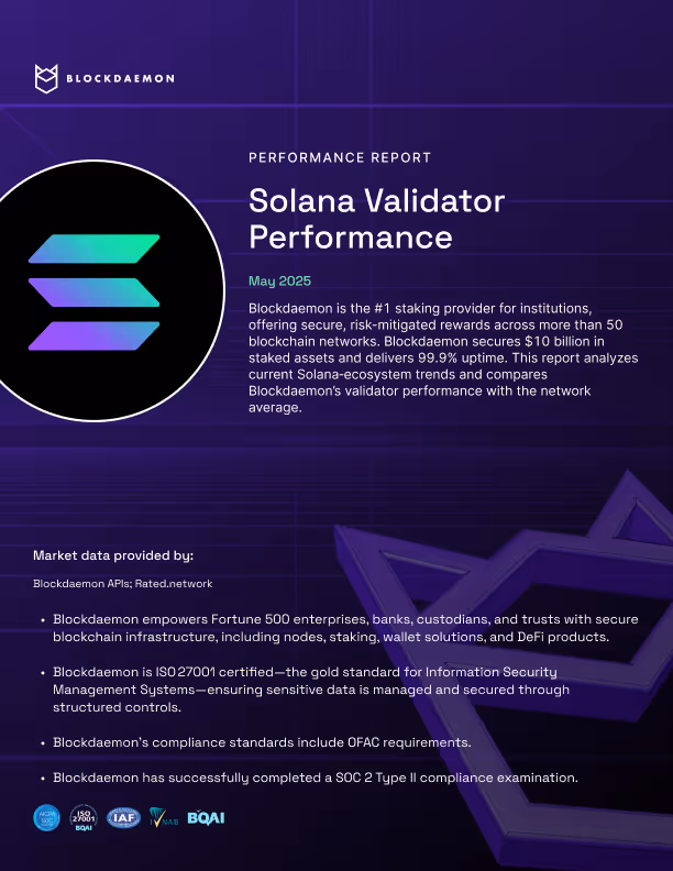 Blockdaemon is the #1 staking provider for institutions, offering secure, risk-mitigated rewards across 50+ blockchain networks. We are entrusted with $10B staked assets and deliver 99.9% uptime. This monthly report contains trends about the current Solana ecosystem and metrics on Blockdaemon’s Solana validator performance comparing it to the network averages. This does not include data on white label validators.