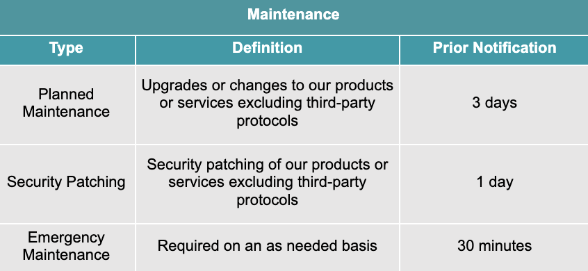 Maintenance. We may from time to time temporarily suspend one or more components of its Services for maintenance. We will use commercially reasonable efforts to conduct any maintenance in windows of four (4) hours or less. We will provide notice to the you about each type of maintenance as described below:
