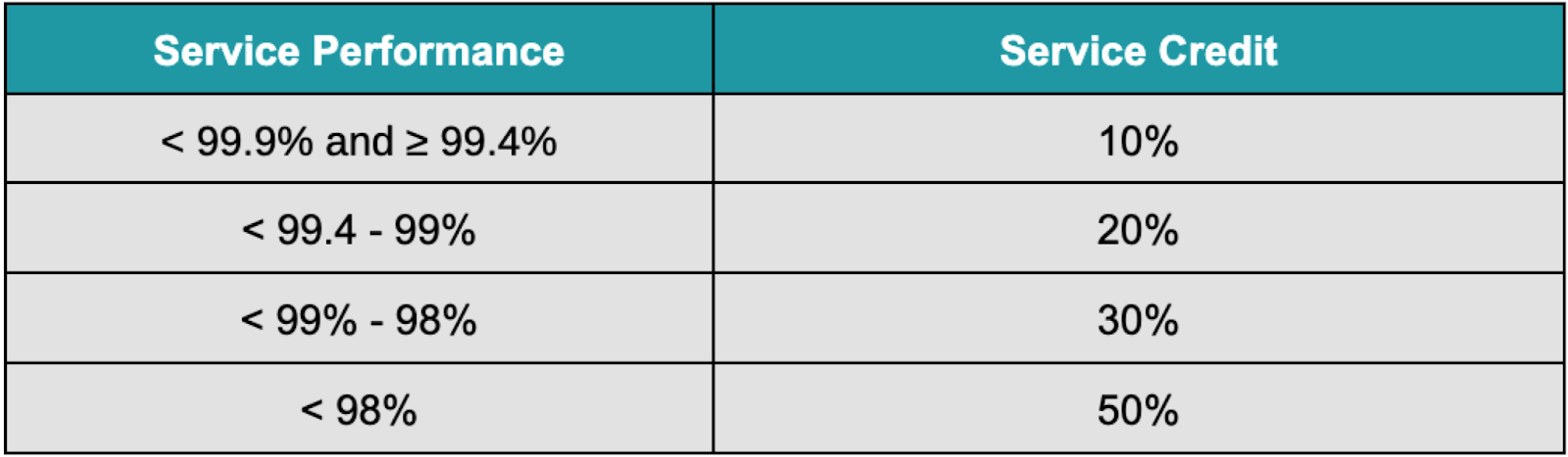 The following table contains the level of Service Credit which will be issued: